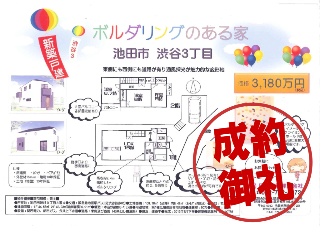 【成約御礼】池田市渋谷3丁目【新築一戸建】分譲 ■ボルタリングのある家
